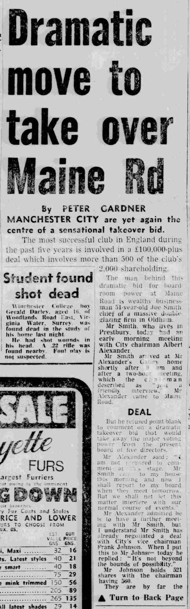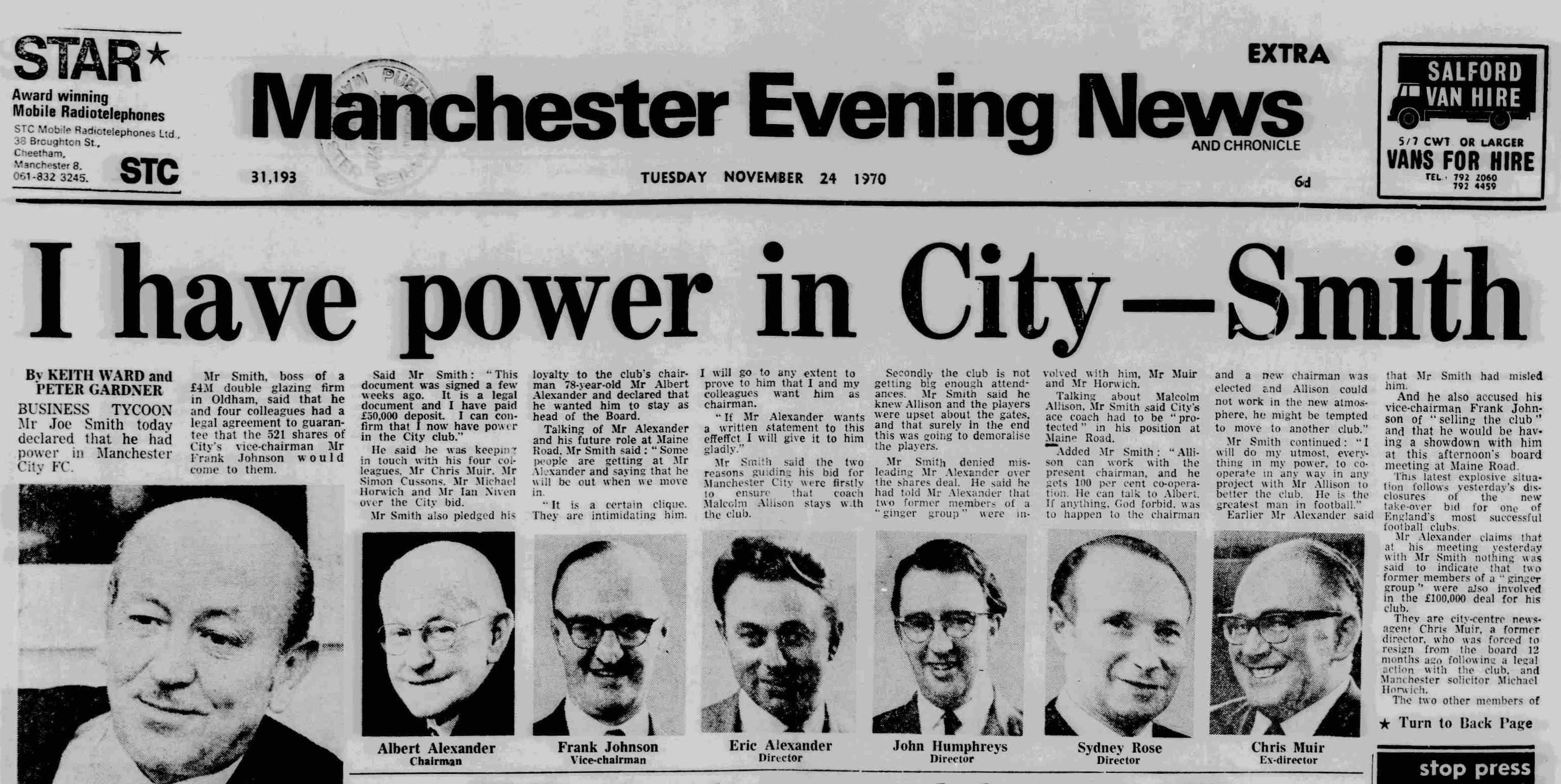 The next day the paper revealed that Smith was head of a consortium that now controlled 40% of the club’s shares. More importantly, with an estimated 200 of the club’s 2,000 shares believed to be missing (the result of a fire at the Hyde Road ground in 1920), the consortium now claimed they effectively had control of the club.