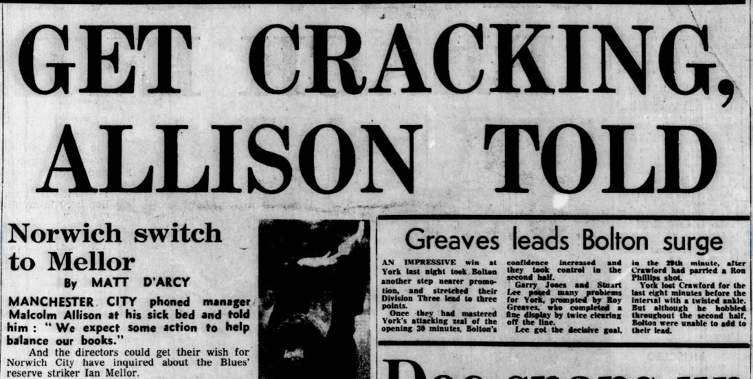 On 7 March, City sold 23-year-old left-winger Ian Mellor, a graduate of the youth team, to Norwich for £65,000. According to the Mirror, it was 'a deal conducted by the directors' and against Allison's wishes.