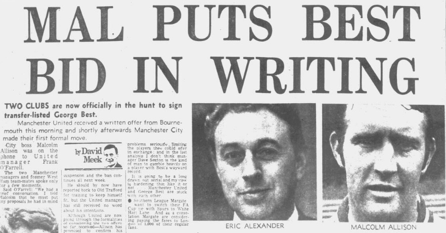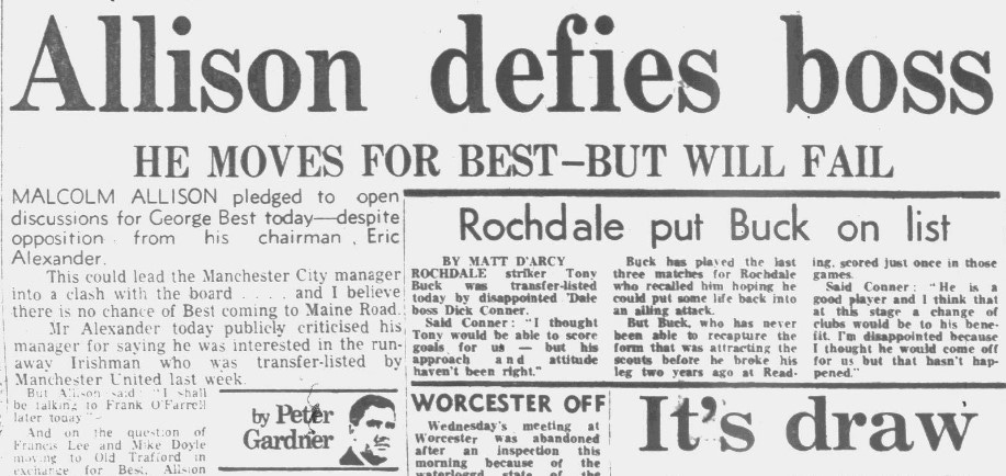 The Manchester Evening News revealed that Allison had told the City board that he intended to sign George Best from Manchester United. Best had been transfer-listed the previous week after he had failed to report for training following a club suspension.