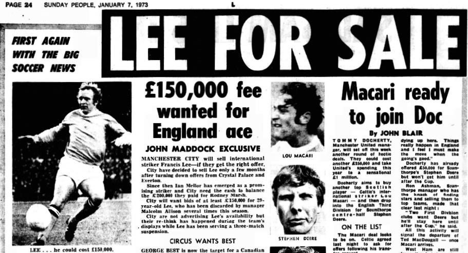 In January, Allison was 'told to do something to balance the books'. On 7 January, the Sunday People exclusively revealed that City were prepared to sell England striker Francis Lee for £150,000.
