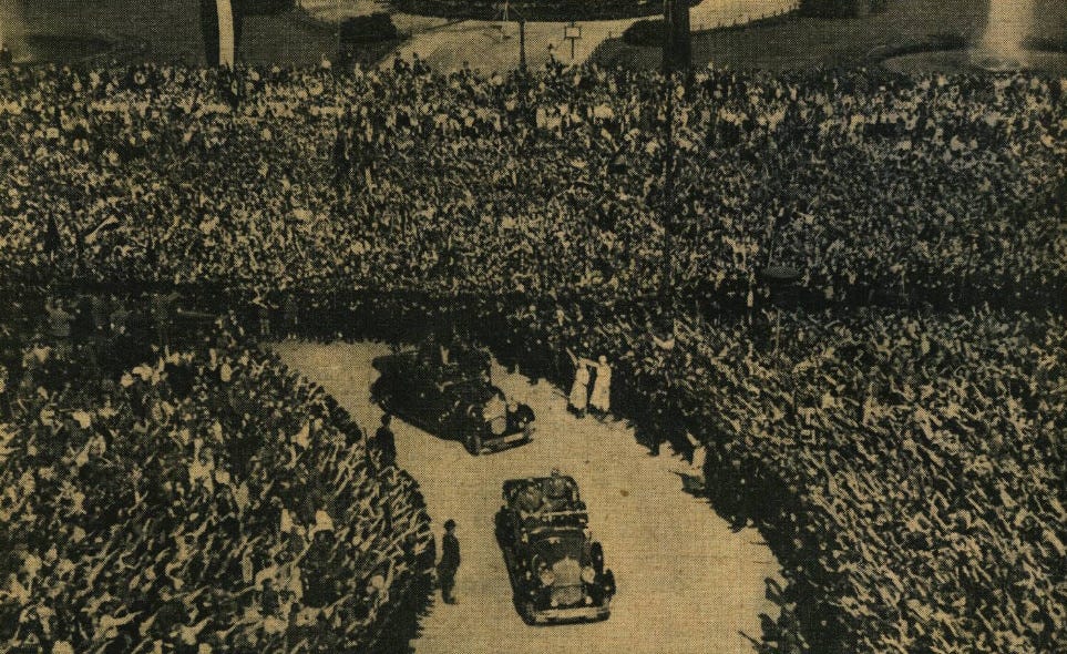 'A forest of hands were raised in the Nazi salute' when Adolf Hitler arrived to address an estimated two million people in Berlin's Lustgarten. Around 14 million more listened on the radio.