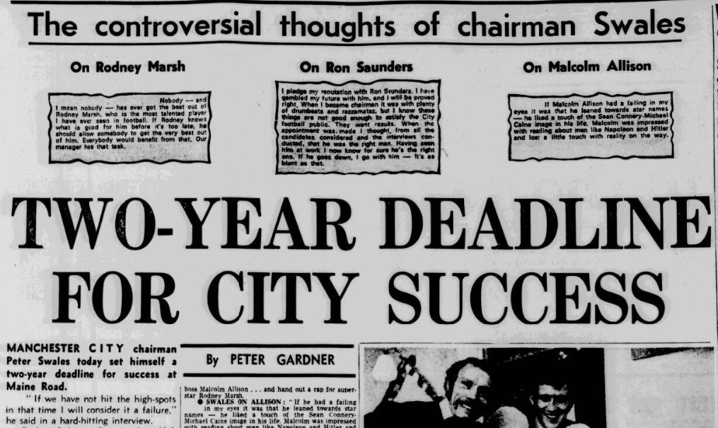 Despite City’s indifferent league form, attendances were still holding up. And with healthy finances bolstered by a successful youth policy, Swales’ optimism was looking well-placed.