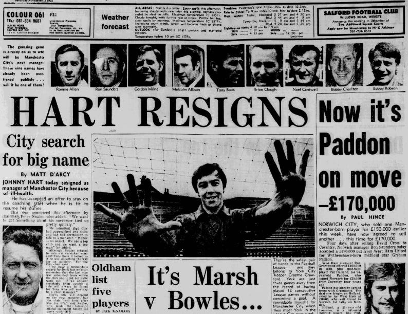 On 17 November 1973, Johnny Hart resigned as City’s manager.