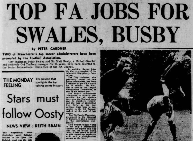 In October, he was the driving force behind a meeting of 16 North-West league clubs held at Maine Road. According to the Liverpool Echo, these turned into regular six-weekly meetings that were ‘designed to ensure that the interests of the North West clubs and their fans are protected’. Although the clubs took turns to host, Swales, along with Sir Matt Busby and Burnley chairman Bob Lord, sat at ‘the top table’.