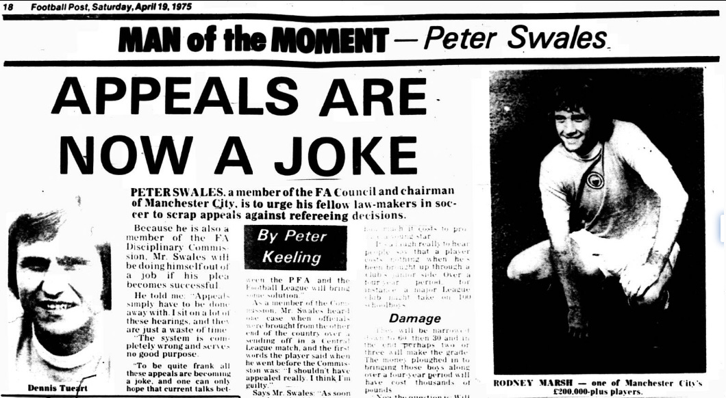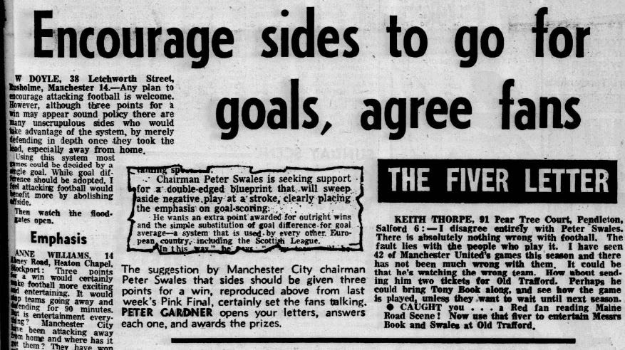 With peace now restored to the City boardroom, Swales focused on putting the football world to rights. In April he called for three points for a win to be introduced to football, a proposal that wasn’t adopted in England until 1981 (and 1994 for World Cups).