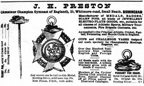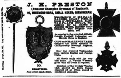 Initially these medals were designed to commemorate great sporting achievements. In August 1884, for instance, a man named Carlisle was presented with a “gold centred Maltese Cross” after reaching the Irwell Hotel in Broughton, Manchester to complete the 4,386th mile out of a 5,100 mile walk in 100 days. But by 1888 you could get one just for being a club secretary or treasurer.
