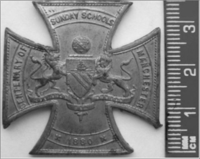 The Midland Railway’s Belle Vue station wasn’t far from Gorton’s Pink Bank Lane ground. So it’s quite possible that a local railway employee, who attended Sunday school in 1880 then stayed to help out, could be in possession of three cross pattee medals by the time the photo was taken. Four or more if he had any success competing at sport.